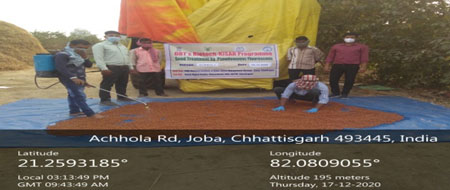| 10 | Demonstration on seed treatment with Bio fertilizer (Trichoderma, PSB, Rhizobium) | Crop + NRM based | Demonstration on seed treatment with Bio fertilizer (Trichoderma, PSB, Rhizobium) on pulse crops (Chickpea, Lathyrus) | 10.11.2020 | Ranjna, Jawali, Kasaipali, Bhanwar, Sonpuri | 218 | ![]() |